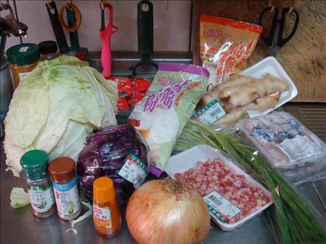 材料有:高筋麵粉、低筋麵粉、高麗菜、紫高麗菜、蟹腿肉、豬繳肉、蔥、嫩薑、洋蔥、咖哩粉、辣椒粉、胡椒粉、醬油、醃肉粉、米酒等