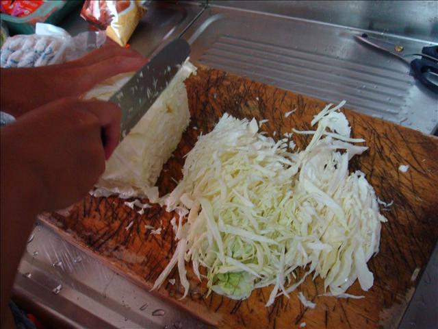 1.將高麗菜、洋蔥、蔥、嫩薑、蟹腿肉用我家的豹紋覘板切碎
