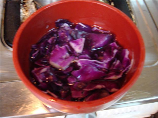 2.把紫高麗菜剝碎用熱水泡,這樣就有紫色的汁了