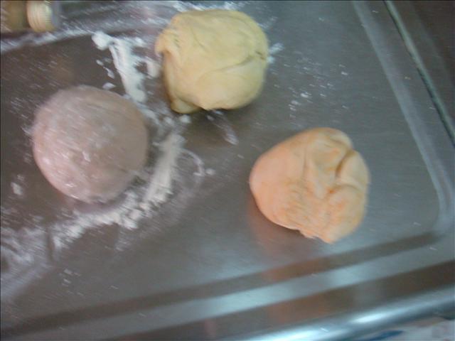5.把麵團分成三等份,一團加咖哩粉,一團加辣椒粉,一團加紫高麗菜汁,揉到三光(手光、碗光、麵團光)