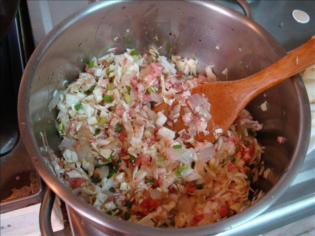 9.這是阿晉師的料:將蟹腿肉、蔥比阿毅師多、高麗菜比阿毅師少、米酒比阿毅師多、白胡椒、辣椒油攪拌均勻(阿晉師因為肥胖不能吃太重口味,所以做的比較清淡,可是很臭)