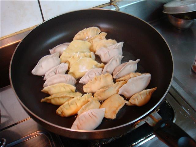 12.把一些餃子放到平底鍋用大量的油煎,煎的酥酥脆脆之後倒入加有麵粉的水,然後蓋上鍋蓋,等7分鐘就可以上桌了!